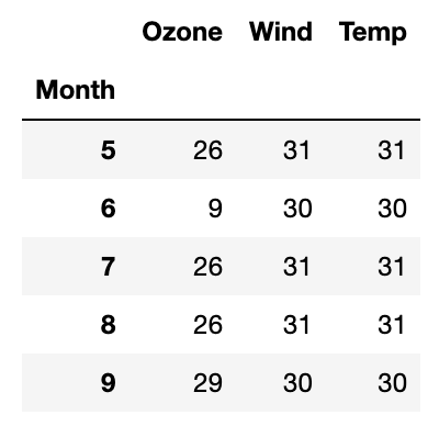 df.groupby('Month')[['Ozone', 'Wind', 'Temp']].mean()